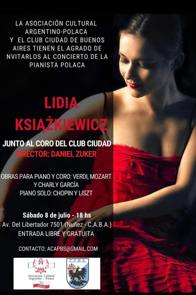 La Asociación Cultural Argentino Polaca y El Club Ciudad de Buenos Aires tienen el agrado de invitarlos al concierto de pianista polaca Lidia Książkiewicz quien en conjunto con el Coro del Club Ciudad presentará obraz de Mozart, Chopin, Verdi, Liszt y… Charly García. Nacida en 1977 en Poznan, Polonia comenzó sus estudios de piano a la […]