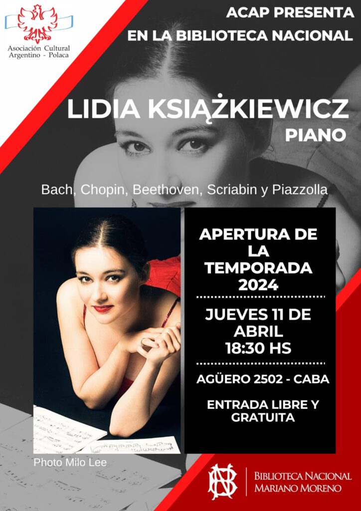 Desde la Asociación Cultural Argentino-Polaca estamos felices de anunciar la apertura de la Temporada 2024 en la Biblioteca Nacional Mariano Moreno. La encargada de abrir el año será la afamada organista y pianista polaca Lidia Ksiazkiewicz, quien interpretará una selección de piezas de Bach, Beethoven, Chopin, Scriabin y Piazzolla. El concierto será el jueves 11 […]